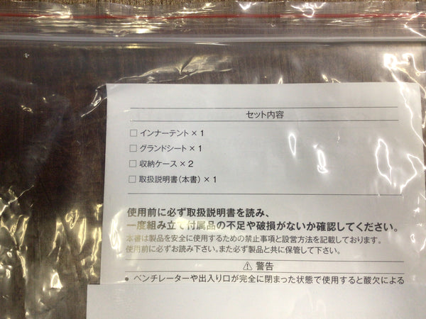 - 構成品:インナーテント、グランドシート、各収納袋、取扱説明書 ※初期状態からの不足品無し