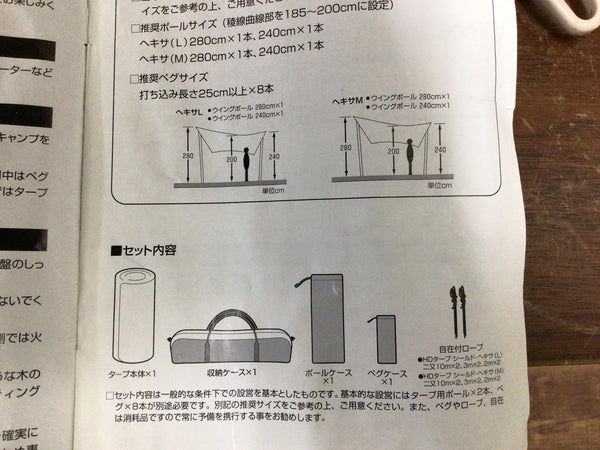 - 構成品:本体、ペグケース、張り綱6本、取扱説明書 ※初期状態からポールケースのみ紛失。またポールやペグは最初から付属しないモデルです
