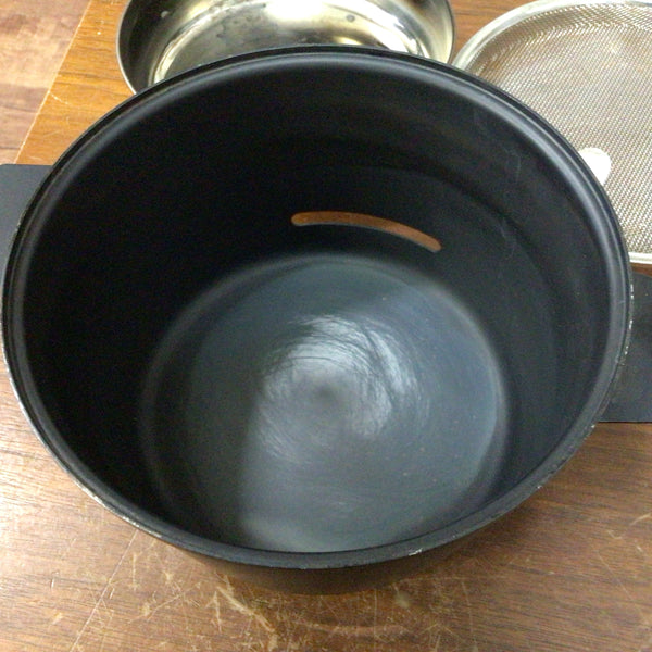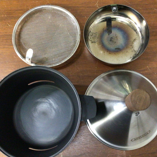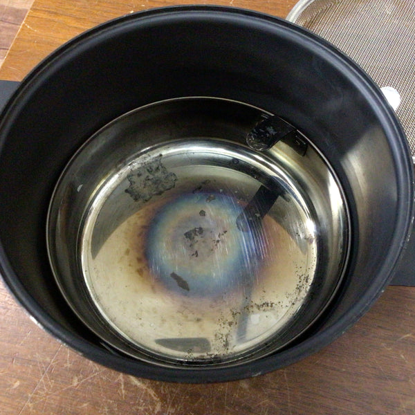 状態は、燻製器としてはかなり良い状態。熱変色や焦げ跡は当然あるんですが、使用回数はせいぜい2,3回ではないでしょうか。燻製器と言うことを考えるとかなりきれいな状態です。