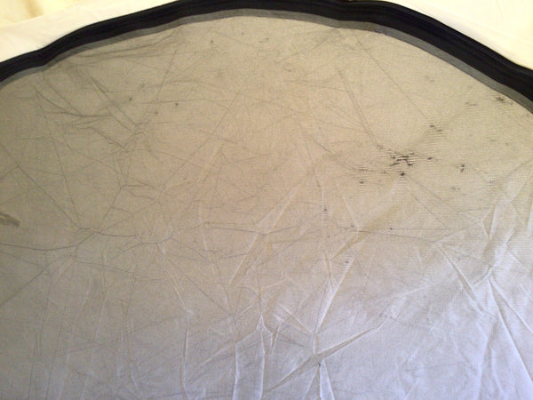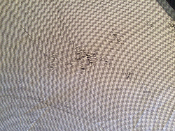 状態は、まあまあ綺麗です。使用回数はおそらく5回程度と思われ、生地のヨレ感は少なめ。穴なども見当たりません。メッシュ部分に偏り・ムラが目立つのと、インナー外側に小さい汚れが少しあります。ペグが28本紛失している以外は揃っています。
